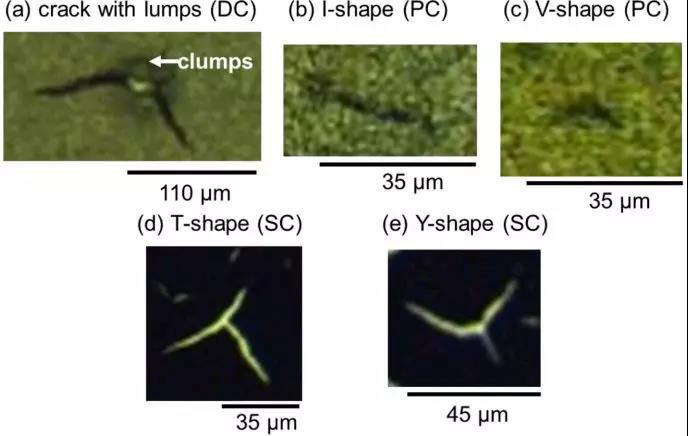 裂痕類(lèi)別(a:E-CLs(8 μm);b:P-CLs(8 μm);c:P-CLs(8 μm);d:P-CLs(12 μm);e:P-CLs(12 μm))