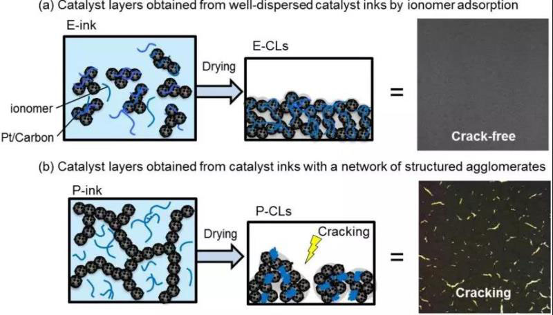 CCT(臨界裂紋厚度)差異示意圖(a:通過(guò)聚合物吸附分散良好的的催化劑漿料(E-ink)在E-CL中產(chǎn)生均一的Pt/C和聚合物物分布;b:催化劑漿料(P-ink)具有結(jié)構(gòu)化的團(tuán)聚體網(wǎng)絡(luò),可產(chǎn)生致密的聚集體,并具有小的Pt/C裸孔和P-CL中的自組織游離聚合物)