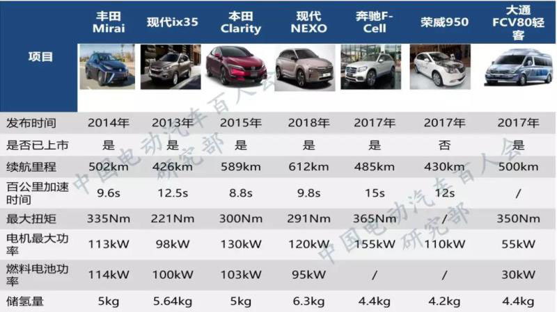 全球各大著名車企紛紛布局氫燃料電池汽車,目前,豐田、本田、現(xiàn)代、寶馬、奔馳、奧迪等國際車企都在緊鑼密鼓的研發(fā)氫燃料電池汽車。其中,豐田Mirai、本田Clarity、現(xiàn)代NEXO三款車型已進(jìn)入量產(chǎn)階段。2018年,我國的燃料電池汽車產(chǎn)量已經(jīng)達(dá)到1527輛,氫燃料電池汽車進(jìn)入快速增長時期。通過對比各主要車企推出的燃料電池車型(圖表8),可以看出我國的燃料電池汽車技術(shù)指標(biāo)接近國際水平但在部分指標(biāo)上尚有差距,與國際主流車型相比續(xù)駛里程還需進(jìn)一步提高,如現(xiàn)代燃料電池汽車NEXO的續(xù)駛里程已經(jīng)達(dá)到612km,另外,我國還需要繼續(xù)突破大功率燃料電池技術(shù),同時我國的氫燃料電池乘用車只是發(fā)布尚未上市,榮威950FCV發(fā)布后并未公開銷售,只用于租賃和示范運行,但由于國內(nèi)其他汽車企業(yè)尚未推出燃料電池乘用車,因此,榮威950FCV仍是我國燃料電池乘用車的代表車型。