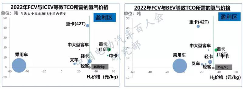 通過降低運營成本,提升全生命周期的經(jīng)濟性,由于目前氫氣價格較高,造成氫燃料電池汽車運營成本居高不下,通過降低氫氣的供給價格來提升燃料電池汽車的經(jīng)濟性,使其具有盈利能力。在假設(shè)2022年燃料電池汽車仍然享受政府補貼的情景下,通過對比燃料電池汽車與燃油汽車、純電動汽車等效TCO所需的氫氣價格,可見在氫氣價格35元/kg基礎(chǔ)上,中卡及18噸重卡燃料電池汽車全生命周期經(jīng)濟性更具優(yōu)勢。