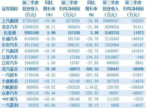 若單看第三季度,車企經(jīng)營狀況更差,凈虧損企業(yè)數(shù)高達(dá)9家,占所統(tǒng)計車企的60%,還能實現(xiàn)盈利的幾乎均為行業(yè)龍頭如上汽集團(tuán)、北京汽車(港股01958)、比亞迪、長城汽車(港股02333)、廣汽集團(tuán)(港股02238)。