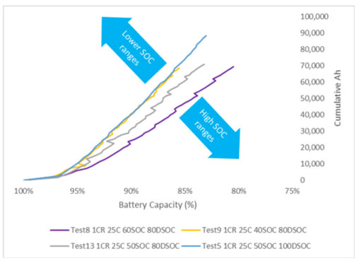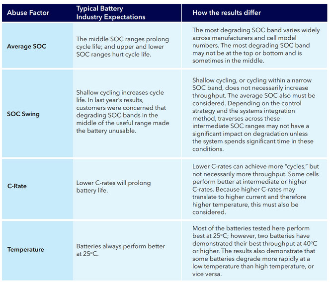 DNV GL公司的一個研究小組增加了測試電池產(chǎn)品的數(shù)量(16種電池),并增加了測試項目,以包括近500條單獨的電池測試曲線。DNV GL的電池產(chǎn)品合格計劃(PQP)測試了電池的四種“濫用因素”:平均充電狀態(tài)(SOC)、平均充電狀態(tài)(SOC)波動(或窗口)、電池充放電速率(C速率)和溫度。其邏輯是這四個變量主要決定電池的退化行為,并且了解它們對退化的影響,用戶可以在項目財務(wù)模型中獲得有關(guān)更換電池時間間隔的信息,從而了解電池更換成本。