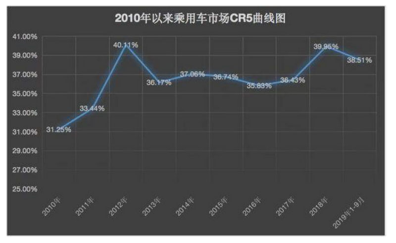 經(jīng)濟(jì)觀察報(bào)記者統(tǒng)計(jì)了從2010年至2019年9月的乘用車前五名企業(yè)的市場集中度(簡稱CR5)。整體來看,汽車行業(yè)集中度在過去十年走過了一條頗為曲折的路線。