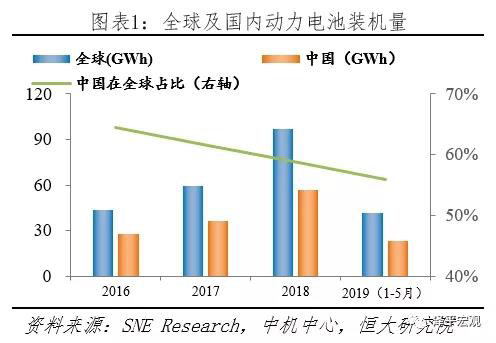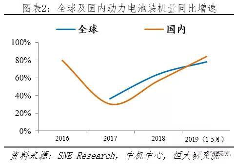 受益新能源汽車(chē)產(chǎn)銷(xiāo)規(guī)模擴(kuò)大及單車(chē)帶電量提升,動(dòng)力電池市場(chǎng)保持高速增長(zhǎng)。據(jù)中機(jī)中心合格證數(shù)據(jù)統(tǒng)計(jì),2009-2018年期間,我國(guó)動(dòng)力電池裝機(jī)量從0.028GWh增加到57.04GWh,十年增長(zhǎng)超千倍,年復(fù)合增速達(dá)233.17%。據(jù)SNE Research和中機(jī)中心統(tǒng)計(jì),2019年1-5月全球市場(chǎng)動(dòng)力電池裝機(jī)量為41.76GWh,同比增長(zhǎng)78.00%;國(guó)內(nèi)市場(chǎng)動(dòng)力電池裝機(jī)量為23.37GWh,同比增長(zhǎng)83.94%。