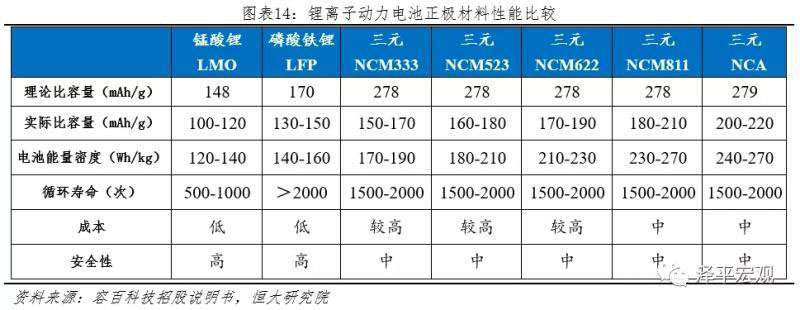 商用鋰離子動(dòng)力電池正極材料主要有錳酸鋰、磷酸鐵鋰、三元體系,其中三元體系又可細(xì)分為鎳鈷錳NCM和鎳鈷鋁NCA。三元材料在能量密度方面有明顯優(yōu)勢(shì),已成為應(yīng)用主流。