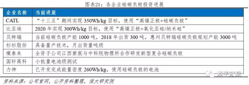 碳負(fù)極有望成為下一代負(fù)極材料。商用化石墨負(fù)極實(shí)際容量已接近理論值372mAh/g,提升空間有限,急需尋找新的替代材料。Si單質(zhì)由于充電過(guò)程中體積膨脹大(接近300%,石墨10%),首次充電效率低、材料加工成本高、導(dǎo)電率差等缺點(diǎn),無(wú)法單獨(dú)作為負(fù)極,但是其超高的理論容量(4200mAh/g)可成為理想的添加劑,碳負(fù)極中加入少量Si(5-10%)可顯著提升容量,硅碳負(fù)極有望成為下一代負(fù)極材料,各企業(yè)紛紛布局。國(guó)外松下硅碳負(fù)極技術(shù)領(lǐng)先,在2013年即實(shí)現(xiàn)量產(chǎn)(NCR18650),特斯拉Model 3用動(dòng)力電池即采用硅碳負(fù)極。