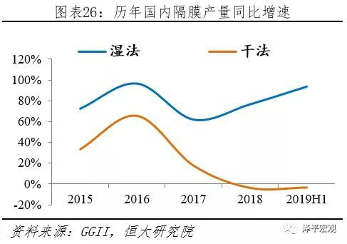 濕法隔膜是當(dāng)前主流,占比逐年提升。據(jù)GGII披露,2019上半年我國(guó)隔膜總產(chǎn)量11.5萬(wàn)噸,其中濕法、干法分別生產(chǎn)8.39、3.11萬(wàn)噸,同比增速93.54%、-3.74%。從趨勢(shì)上看,濕法隔膜市場(chǎng)占比逐年提升,從2015年38.05%增加到2019上半年72.96%。在動(dòng)力電池領(lǐng)域,濕法隔膜在性能和安全性上有著超越干法的顯著優(yōu)勢(shì),更能夠適應(yīng)當(dāng)前動(dòng)力電池高能量密度化發(fā)展趨勢(shì)。