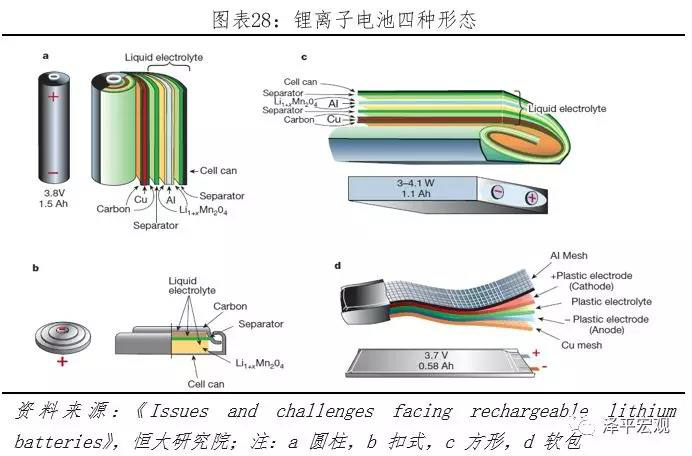 鋰離子電池按照封裝形態(tài)可分為圓柱、扣式、方形、軟包四種,其中扣式基本只在實(shí)驗(yàn)室測(cè)試使用。