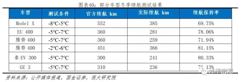低溫不僅降低材料的反應(yīng)活性,而且會(huì)造成電解液凝固、離子遷移率降低、極化電壓增大等。應(yīng)用到動(dòng)力電池,低溫就會(huì)造成:1)放電容量降低(部分Li+來(lái)不及反應(yīng));2)倍率性能下降(電解液接近凝固,離子遷移率下降);3)放電平臺(tái)降低(電池阻抗增加,極化電壓增大)。根據(jù)部分代表車(chē)型冬季續(xù)航測(cè)試結(jié)果可以發(fā)現(xiàn),在0℃左右的情況下,電動(dòng)車(chē)?yán)m(xù)航會(huì)下降20-30%左右。