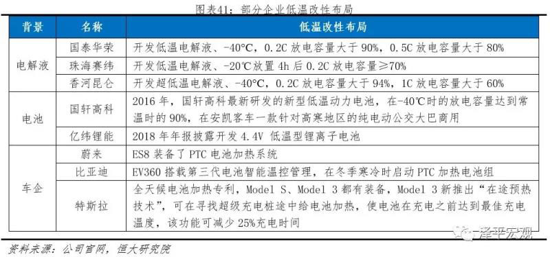 各企業(yè)布局低溫改性技術(shù),改善電動(dòng)車(chē)冬季續(xù)航。電解液廠(chǎng)國(guó)泰華榮針對(duì)性開(kāi)發(fā)低溫電解液,公司搭載該款電解液電池產(chǎn)品,-40°C、0.2C放電容量大于90%,0.5C放電容量大于80%。電池廠(chǎng)國(guó)軒高科,針對(duì)高寒低區(qū)開(kāi)發(fā)的低溫動(dòng)力電池,-40℃放電容量可達(dá)到常溫90%。整車(chē)廠(chǎng)蔚來(lái)、比亞迪等在其最新車(chē)型均搭載智能溫控系統(tǒng),在低溫下啟動(dòng)PTC加熱電池組。