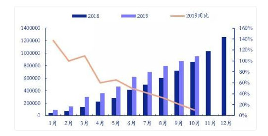 從累計銷量數據上來看,今年1-10月新能源汽車累計實現產量98.3萬輛,累計實現銷量94.7萬輛,同比分別增長11.7%和10.1%。從累計銷量數據直方圖中可以看出,雖然累計銷量同比一直是處在正增長態(tài)勢,但累計銷量同比增速從6月開始已經出現連續(xù)5個月的下滑。