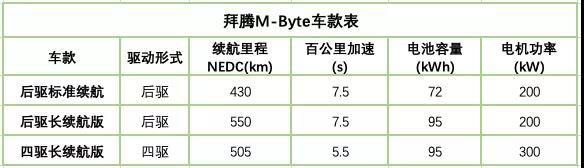 據(jù)官方透露,拜騰M-Byte開始的時候會提供3個版本供消費者選擇,分別是“后驅(qū)標準電池版”、“后驅(qū)長續(xù)航版”、“四驅(qū)長續(xù)航版”。