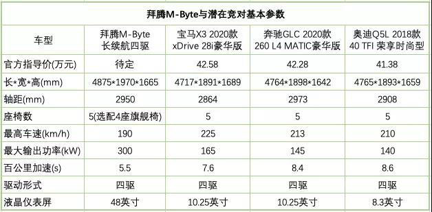 在這次亮相中,拜騰方面對外發(fā)布了一部分的M-Byte的配置信息,這是一款將會不斷地“蠶食”寶馬X3、奔馳GLC和奧迪Q5市場份額的車型。