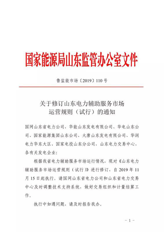 11月11日,山東能監(jiān)辦印發(fā)《山東電力輔助服務(wù)市場(chǎng)運(yùn)營(yíng)規(guī)則(試行)》2019年11月修訂稿,修訂版本的運(yùn)營(yíng)規(guī)則將于11月15日起正式執(zhí)行。