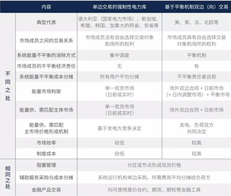 在“強制電力庫” 中,只有市場組織者一個買者,發(fā)電方不能與負(fù)荷方直接交易,所有發(fā)電商都只能將電賣給系統(tǒng)運營機構(gòu),所有經(jīng)銷商和批發(fā)購電的大用戶也只能向系統(tǒng)運營機構(gòu)買電,因而強制電力庫也被稱為單邊(向)交易的電力批發(fā)市場。而“雙邊(向)交易” 的批發(fā)市場中有多個買者,且買、賣雙方可自由選擇交易的對象和場所。但這種自由的電力批發(fā)交易也是有代價的,即未按合同發(fā)、用電者,須為由此造成的系統(tǒng)不平衡承擔(dān)經(jīng)濟責(zé)任。因此,平衡機制也被認(rèn)為是“雙邊(向)交易” 的基石或核心。所以,盡管各國電力批發(fā)市場構(gòu)建的實踐千差萬別,但本質(zhì)上都是在單邊交易的“強制電力庫(單邊交易) ” 和基于平衡機制的“雙邊(向)交易” 之間進行選擇。在澳大利亞、新加坡、加拿大的阿爾伯塔省等國家和地區(qū),現(xiàn)行的交易模式都是單邊交易的“強制性電力庫” ,在英國、德國、法國、美國已市場化改革的各州及北歐等國家和地區(qū),現(xiàn)行的交易模式均為基于平衡機制的“雙邊(向)交易” 。