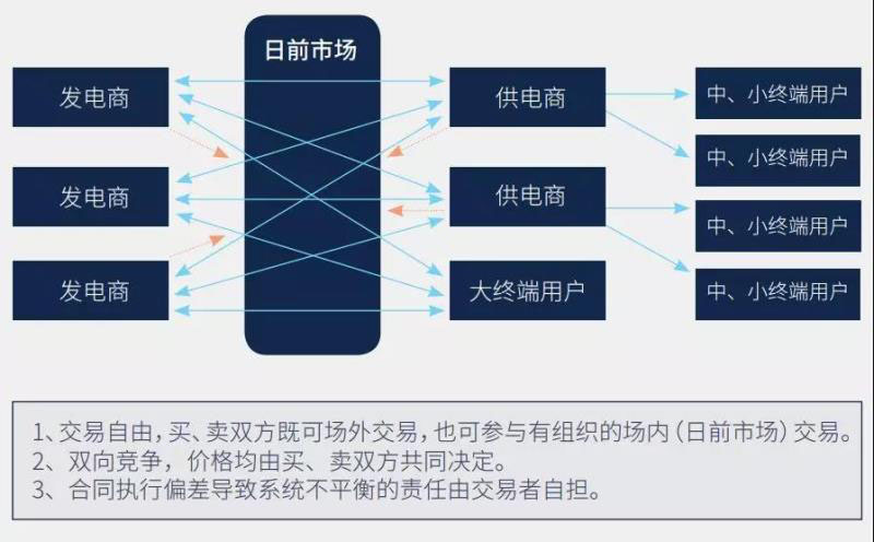 反之,如果發(fā)電方與負(fù)荷方的交易關(guān)系是“雙邊(向) ” 的,該市場的構(gòu)架就要復(fù)雜很多。一是場外的雙邊合同交易必不可少;二是要有自愿參加、雙向交易的“日前市場” , 市場成員的自由選擇權(quán)才能完整體現(xiàn);三是必須有平衡市場。因為負(fù)荷突然變化、輸電阻塞、發(fā)電故障等意外情況總會發(fā)生,由此而導(dǎo)致交易合同不能完全執(zhí)行、進而引發(fā)系統(tǒng)能量不平衡的情況在所難免,這就必須有“平衡機制” 設(shè)計,從而“平衡市場” 也必不可少。所以,雙邊(向)交易的市場構(gòu)架,通常由互為條件、相輔相成的三大部分組成:場外雙邊合同 + 日前市場 +(實時)平衡市場。場外雙邊合同與日前市場共同構(gòu)成能量交易的主體市場。(實時)平衡市場是不平衡電量交易的市場,用于彌補雙邊(向)交易的合同執(zhí)行偏差、并確定不平衡責(zé)任者應(yīng)付費用,是平衡機制的市場化執(zhí)行方式。