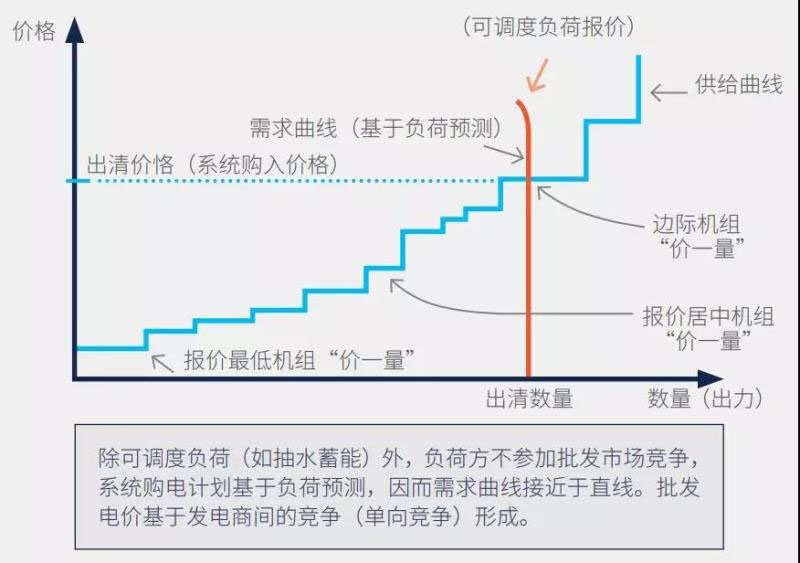 能量現(xiàn)貨市場的出清機制。所謂能量現(xiàn)貨市場,是指分時段的電能量(標(biāo)準(zhǔn)化了的電力產(chǎn)品)集中交易,通常在不晚于交付日的前一日開市。如前所述,日間不同時段的電力供給,其效用和成本均大不相同。因此,一個發(fā)育成熟的電力市場必須有不晚于日前安排的電力分時交易,才能完整地反映電力供求關(guān)系的形成特點,進而有效率地配置電力資源。但在不同的交易關(guān)系中,能量現(xiàn)貨市場的出清機制則大不相同:“單邊(向)交易” 的現(xiàn)貨市場買方單一,市場出清機制自然也是單向的,即由市場組織者基于發(fā)電商的單向競爭決定;而“雙邊(向)交易” 的現(xiàn)貨市場(日前市場)中,既有發(fā)電方賣電也有負(fù)荷方買電,且交易者可自由進出。因此,其成交的數(shù)量和價格,也必然同場外中長期合同交易一樣,由發(fā)電方與負(fù)荷方的雙向競爭決定。