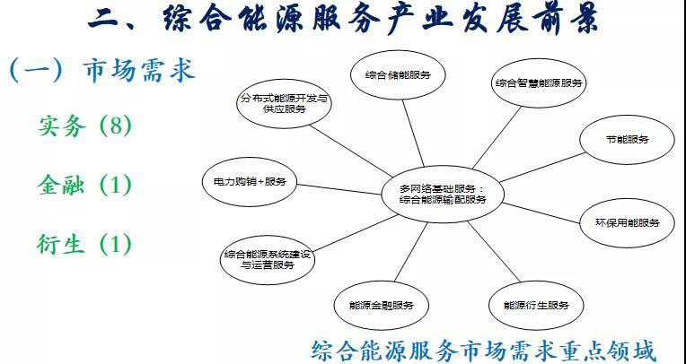 可以預(yù)見,綜合能源服務(wù)的市場需求將是巨大的,需求的重點(diǎn)領(lǐng)域可以體現(xiàn)在綜合能源系統(tǒng)建設(shè)與運(yùn)營服務(wù)、電力購銷+服務(wù)、分布式能源開發(fā)與供應(yīng)服務(wù)、綜合儲(chǔ)能服務(wù)、綜合智慧能源服務(wù)、節(jié)能服務(wù)、環(huán)保用能服務(wù)、能源銜生服務(wù)、能源金融等方面。