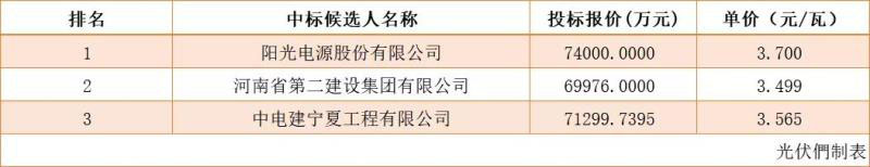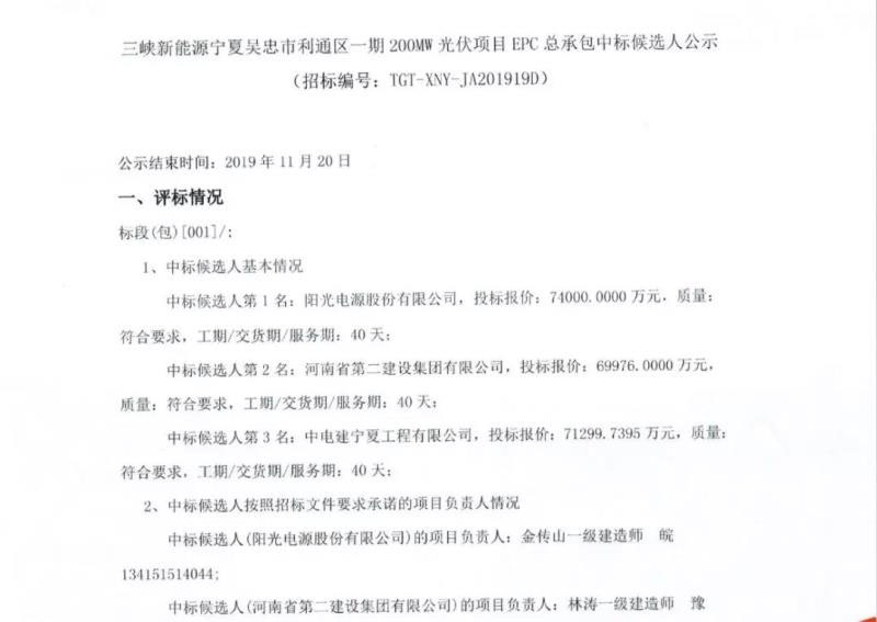 2019年11月18日,三峽新能源寧夏吳忠市利通區(qū)一期200MW光伏項目EPC總承包中標候選人公示。其中,陽光電源股份有限公司以總價74000萬元,單價3.7元/瓦位列第一中標候選人。值得一提的是,該價格為三名中標候選人報價中的最高價。具體信息如下: