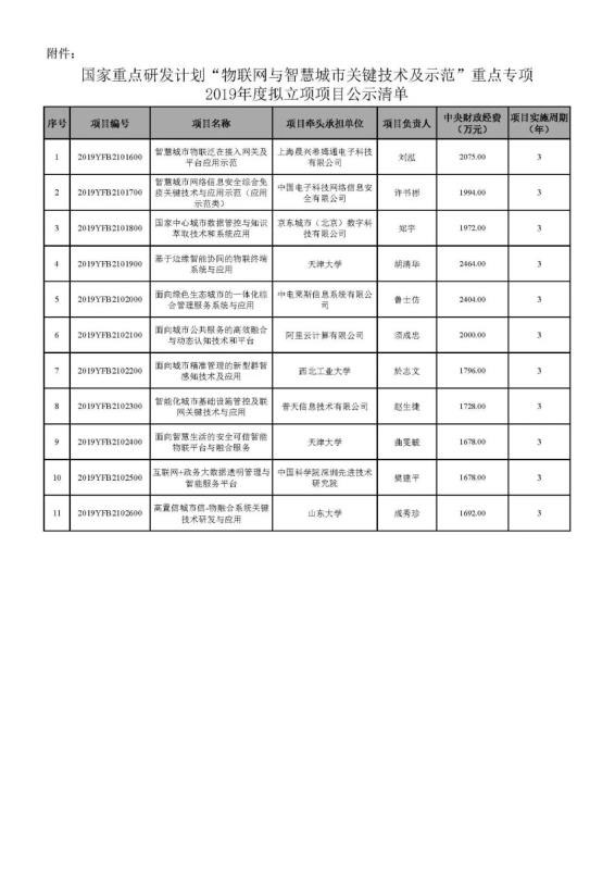 根據(jù)《國務(wù)院關(guān)于改進(jìn)加強(qiáng)中央財政科研項目和資金管理的若干意見》(國發(fā)〔2014〕11號)、《國務(wù)院關(guān)于深化中央財政科技計劃(專項、基金等)管理改革方案的通知》(國發(fā)〔2014〕64號)、《科技部、財政部關(guān)于印發(fā)<國家重點研發(fā)計劃管理暫行辦法>的通知》(國科發(fā)資〔2017〕152號)等文件要求,現(xiàn)對“物聯(lián)網(wǎng)與智慧城市關(guān)鍵技術(shù)及示范”重點專項2019年度擬立項的項目信息進(jìn)行公示(詳見附件)。