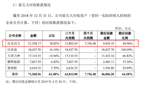 另外,比克動(dòng)力四個(gè)月內(nèi)到期應(yīng)收賬款為7756.48萬(wàn)元,前五大應(yīng)收客戶中,除了比克動(dòng)力外沒(méi)有四個(gè)月內(nèi)到期應(yīng)收賬款。