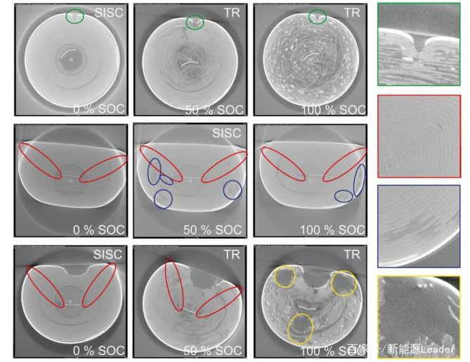 在采用5mm直徑鋼針擠壓測試中,電芯也發(fā)生了顯著的變形,0%SoC電池變形量達(dá)到了20%左右,因此也同樣引起了電芯中的結(jié)構(gòu)塌陷,在100%SoC的電池中我們也看到了兩個(gè)空洞(黃色標(biāo)示),這主要是在熱失控中電池產(chǎn)生的大量氣體將電芯內(nèi)的物質(zhì)帶到了電池外部。