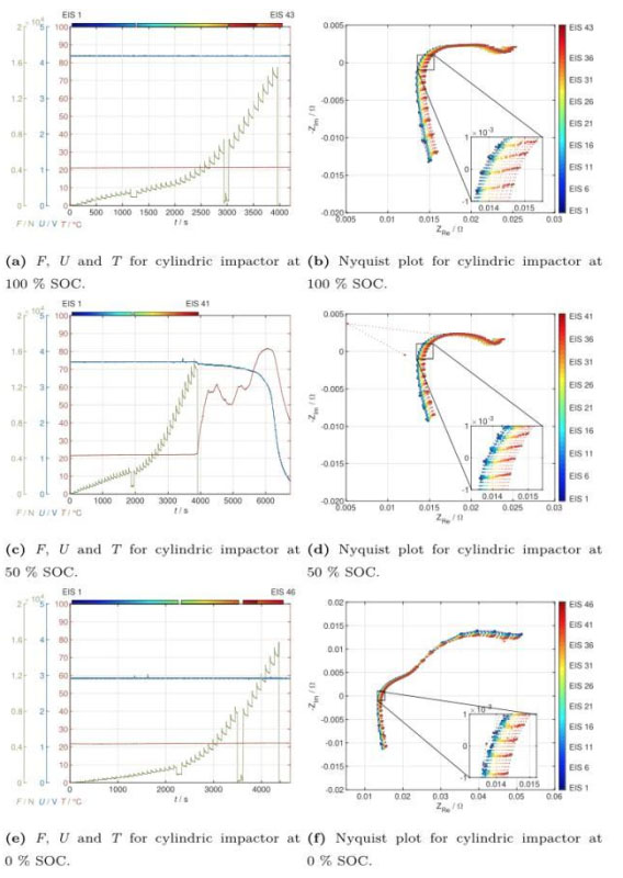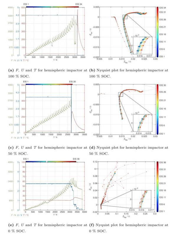 下圖為采用20mm直徑圓形擠壓頭的擠壓測試結(jié)果,下圖a為100%SoC狀態(tài)下的測試結(jié)果,從圖中能夠看到在整個(gè)測試過程中電池的溫度和電壓沒有發(fā)生顯著的改變,表明整個(gè)測試過程中電池均沒有發(fā)生內(nèi)短路,從下圖b的EIS測試曲線可以看到在整個(gè)的測試過程中電池的歐姆阻抗在持續(xù)的增加。
