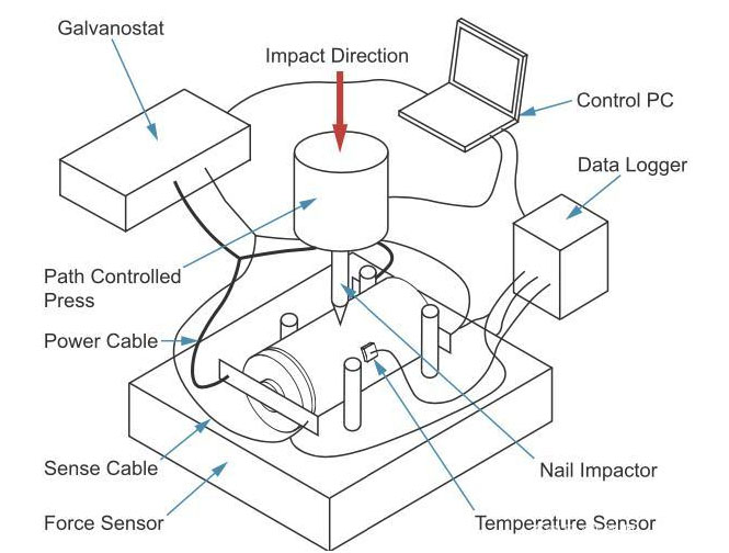 安全測試中的擠壓方向如上圖中的紅色箭頭所示,為了模擬不同的失效模式對于電池阻抗的影響,作者分別采用三種擠壓件:1)為了模擬大面積變形的情況,采用了一個(gè)直徑20mm的鋼針;2)為了模擬局部破壞的情況,采用了一個(gè)直徑3mm的鋼針;3)為了模擬同時(shí)存在大面積變形和局部破壞的情況,采用了5mm的鋼針。擠壓測試過程中,擠壓速度0.1mm/s,每0.2mm停留90s,用以測試鋰離子電池在這一狀態(tài)下的阻抗變化,實(shí)驗(yàn)裝置如下圖所示。