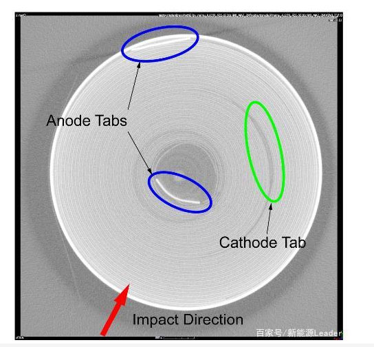實(shí)驗(yàn)中采用的電池為來自三星的INR18650-25R,額定容量為2500mAh,最大持續(xù)放電電流為20A。下圖為該電池的內(nèi)部結(jié)構(gòu)圖,從圖中能夠看到該電芯中間沒有鋼芯,正極在中間位置具有一個(gè)極耳,負(fù)極在電極的兩端分別有一個(gè)極耳。由于SoC狀態(tài)對于電池安全測試和阻抗測試都有顯著的影響,實(shí)驗(yàn)中分別測試了在0%、50%和100%SoC狀態(tài)下電池進(jìn)行安全測試過程中阻抗的變化。