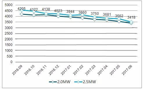 盡管2014-2015期間,由于出現(xiàn)風(fēng)電搶裝潮,風(fēng)機(jī)價格有小幅提升,但均價從未高于4500元/千瓦,2016年后更是一路下滑。