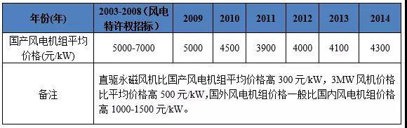 2003-2014年國內(nèi)風(fēng)電機(jī)組平均價格(來源:計鵬咨詢)