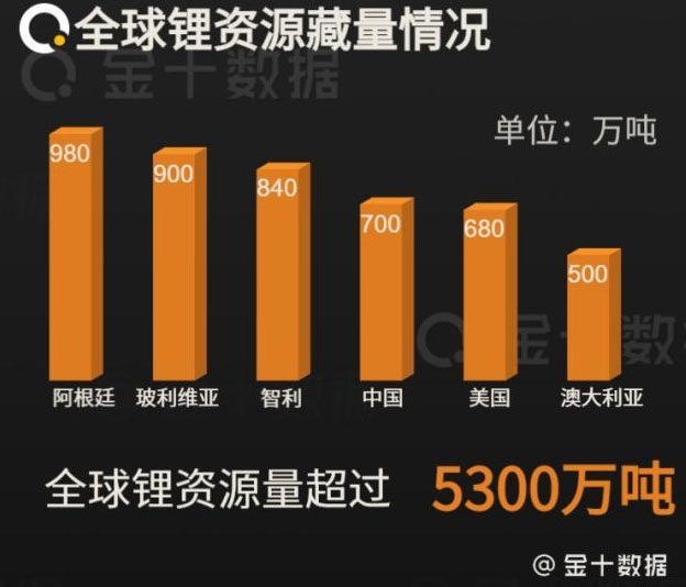 隨著各國開足馬力加速布局全球鋰市場,中國又是如何應對呢?雖然此前中國工業(yè)用鋰有80%需要依賴進口,但是從資源藏量上來看,中國的鋰礦資源并不少。根據美國地質調查局2018年最新報告顯示,全球鋰資源量超過5300萬噸,其中阿根廷占有980萬噸、玻利維亞占有900萬噸、智利占有840萬噸、中國占有700萬噸、美國占有680萬噸、澳大利亞占有500萬噸。