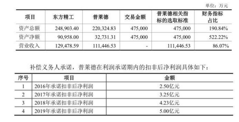 47.5億元的收購(gòu)價(jià)格是當(dāng)時(shí)普萊德資產(chǎn)凈額的5.22倍。同時(shí),普萊德也做出了業(yè)績(jī)承諾,承諾2018年扣非凈利潤(rùn)4.23億元,2019年扣非凈利潤(rùn)5億元。
