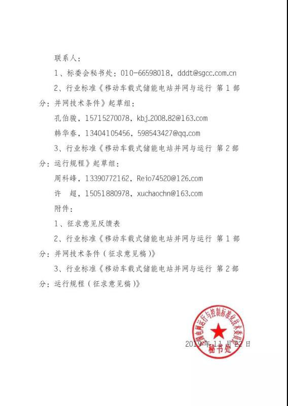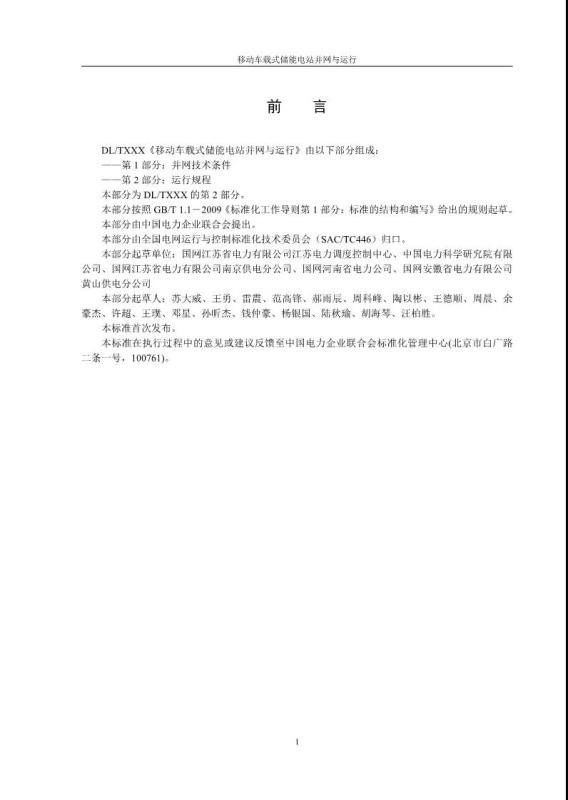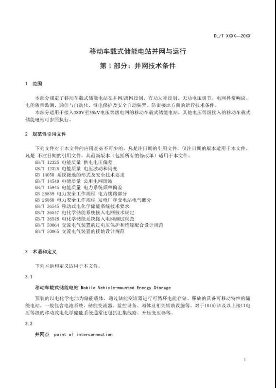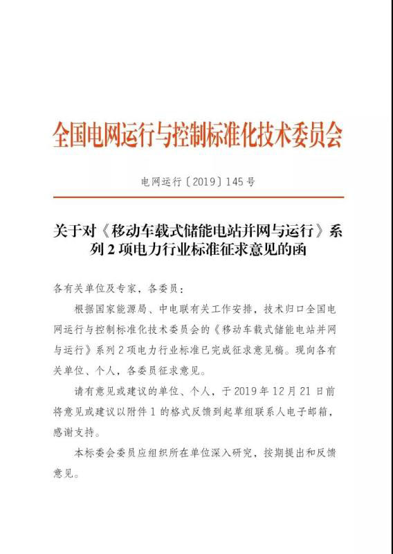 近日,根據(jù)國家能源局、中電聯(lián)有關(guān)工作安排,技術(shù)歸口全國電網(wǎng)運行與控制標(biāo)準(zhǔn)化技術(shù)委員會的《移動車載式儲能電站并網(wǎng)與運行》第1 部分:并網(wǎng)技術(shù)條件和《移動車載式儲能電站并網(wǎng)與運行》第2 部分:運行規(guī)程電力行業(yè)標(biāo)準(zhǔn)已完成征求意見稿,現(xiàn)向各有關(guān)單位、個人,各委員征求意見。起草單位包括國網(wǎng)江蘇省電力有限公司江蘇電力調(diào)度控制中心、中國電力科學(xué)研究院有限公司等。