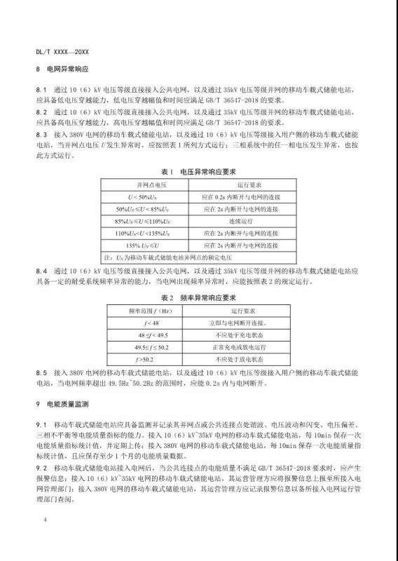 第一 部分“并網(wǎng)技術(shù)條件”:規(guī)定了移動車載式儲能電站在并網(wǎng)/離網(wǎng)控制、有功功率控制、無功電壓調(diào)節(jié)、電網(wǎng)異常響應(yīng)、電能質(zhì)量監(jiān)測、通信與自動化、繼電保護及安全自動裝置、防雷接地方面的運行技術(shù)條件;適用于接入380V至35kV電壓等級電網(wǎng)的移動車載式儲能電站,其他電壓等級接入的移動車載式儲能電站可參照執(zhí)行。