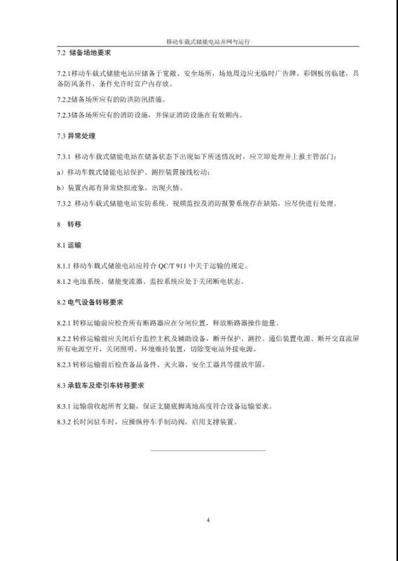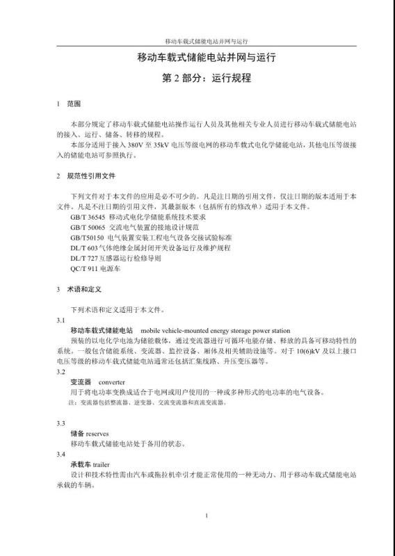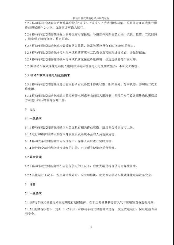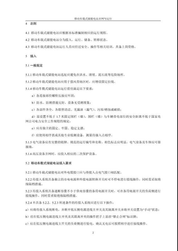 第二部分“運行規(guī)程”:規(guī)定了移動車載式儲能電站操作運行人員及其他相關(guān)專業(yè)人員進行移動車載式儲能電站的接入、運行、儲備、轉(zhuǎn)移的規(guī)程;適用于接入380V 至35kV 電壓等級電網(wǎng)的移動車載式電化學(xué)儲能電站,其他電壓等級接入的儲能電站可參照執(zhí)行。