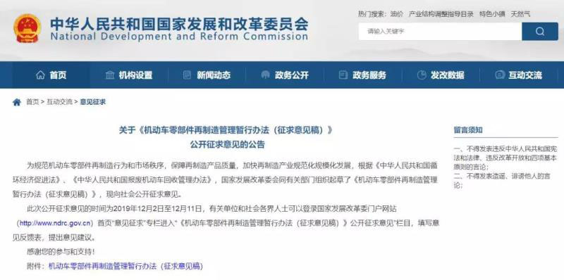 近日,發(fā)改委發(fā)布《機動車零部件再制造管理暫行辦法(征求意見稿)》(以下簡稱《暫行辦法意見稿》),面向社會公開征求意見。