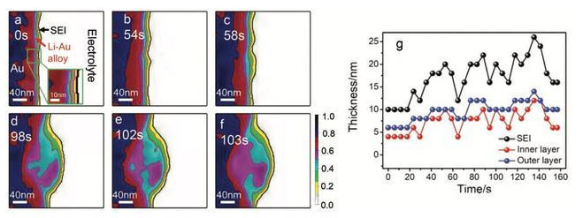 下圖f展示了SEI膜中的內(nèi)層無機(jī)層和外層有機(jī)層的生長(zhǎng)速度,從圖中可以看到SEI膜的內(nèi)外兩層的生長(zhǎng)速度基本一致,同時(shí)我們也注意到隨著金電極體積的不斷膨脹,SEI膜的厚度也在持續(xù)的增加,并且在50s左右時(shí)SEI膜的生長(zhǎng)速度在顯著加速,與之對(duì)應(yīng)的是金電極由于形成孔隙和裂紋而引起體積劇烈膨脹。因此SEI膜的加速生長(zhǎng)可能是由于電極體積膨脹對(duì)SEI膜形成張力,使得電解液等更容易穿過SEI膜發(fā)生分解,從而引起SEI膜加速生長(zhǎng)。