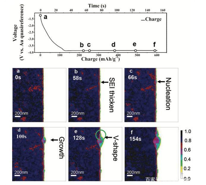 下圖為34C充電過程中SEI膜和金電極的變化,從下圖a可以看到金電極呈現(xiàn)出多晶結(jié)構(gòu),晶體顆粒的平均直徑為100nm,從圖b和c可以看到SEI膜的厚度也是不均勻的,局部SEI膜的厚度與Li-Au合金的成核和生長(zhǎng)密切相關(guān)。從下圖d和e可以看到,在Li-Au合金成核后會(huì)導(dǎo)致局部的體積發(fā)生巨大的膨脹,從而對(duì)SEI膜形成張力,使得局部的SEI膜變薄,保護(hù)性降低,進(jìn)而加速局部SEI膜的生長(zhǎng)速度,再使得該處SEI膜厚度增加。