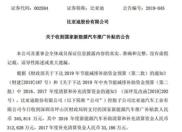 實(shí)際上,早在今年5月份,比亞迪就收到國家新能源汽車推廣補(bǔ)貼款約人民幣34.58億元。其中,2016年度新能源汽車補(bǔ)助清算和補(bǔ)充清算資金約31.26億元,2017年度補(bǔ)充清算資金約3.32億元。自2011年上市以來,比亞迪所獲得的政府補(bǔ)助逐年增加,在本次獲得2018年補(bǔ)貼之前,近9年,比亞迪計(jì)入損益的政府補(bǔ)助總額約為104.26億元。