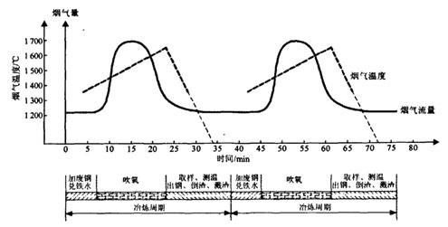 鋼鐵企業(yè)的轉(zhuǎn)爐煉鋼工藝是產(chǎn)生間歇性余熱的主要環(huán)節(jié),在一個(gè)冶煉周期內(nèi),分為裝料、吹煉和出鋼三個(gè)步驟,把裝入的鐵水經(jīng)過(guò)吹氧,完成降碳、升溫、脫磷等高溫物理化學(xué)反應(yīng),最后排出大量的CO、CO2等高溫廢氣,這種工藝決定了轉(zhuǎn)爐高溫?zé)煔饩哂虚g歇性,波動(dòng)性和周期性[1,2],如下圖1所示