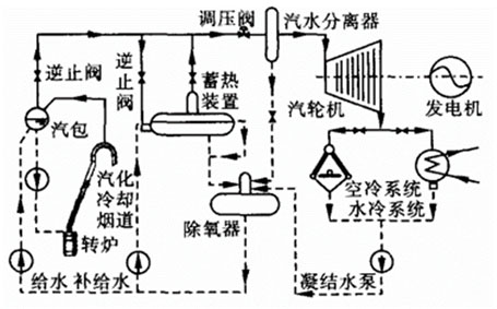 如上圖所示,基于蒸汽儲(chǔ)熱器的轉(zhuǎn)爐余熱發(fā)電系統(tǒng)主要包括汽化冷卻煙道余熱鍋爐、飽和蒸汽輪機(jī)、發(fā)電機(jī)三大主體設(shè)備及蒸汽儲(chǔ)熱、排氣冷卻(空冷系統(tǒng)或水冷系統(tǒng))、給水除氧三大汽水系統(tǒng)。