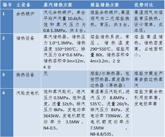 從上表可以看出,在采用相同的余熱資源條件下,熔鹽儲(chǔ)熱方案能夠充分利用高溫余熱的高品位熱能,提高能量利用效率,發(fā)電量能夠達(dá)到蒸汽儲(chǔ)熱方案的2倍,具有較大的技術(shù)優(yōu)勢(shì)和高效能源利用優(yōu)勢(shì)。