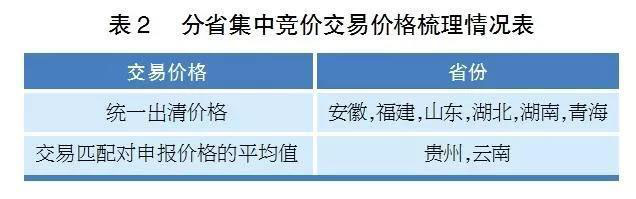 各省均規(guī)定雙邊交易價(jià)格按照雙方合同約定執(zhí)行,掛牌交易價(jià)格以掛牌價(jià)格結(jié)算。對(duì)集中競(jìng)價(jià)交易價(jià)格,部分省份進(jìn)行了限定和補(bǔ)充。安徽、福建、山東、湖北、湖南、青海規(guī)定集中競(jìng)價(jià)交易按照統(tǒng)一出清價(jià)格確定,貴州、云南規(guī)定集中競(jìng)價(jià)交易根據(jù)各交易匹配對(duì)的申報(bào)價(jià)格形成交價(jià)格,即賣方報(bào)價(jià)和買方報(bào)價(jià)的平均值,梳理情況如表2所示。山西提出集中撮合時(shí),電力交易系統(tǒng)匹配過程中考慮環(huán)保、能耗等因素,發(fā)電企業(yè)按環(huán)保調(diào)整價(jià)由低到高排序。吉林提出電能清潔供暖用戶可采取電網(wǎng)購銷差價(jià)不變的方式。廣東規(guī)定集合競(jìng)價(jià)階段以最后一個(gè)成交對(duì)的買方申報(bào)價(jià)格、賣方申報(bào)價(jià)格的算數(shù)平均值作為統(tǒng)一成交價(jià)格;連續(xù)競(jìng)價(jià)階段可成交交易對(duì)的成交價(jià)格根據(jù)買賣雙方的申報(bào)價(jià)格,以及前一筆交易成交價(jià)格確定。