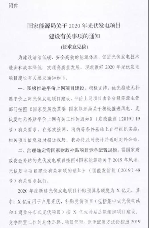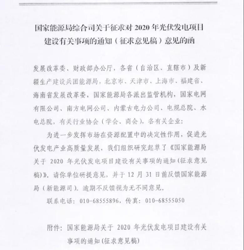 近日,光伏們獲悉,各省能源主管部門已經(jīng)收到國家能源局下發(fā)的《關(guān)于征求對2020年光伏發(fā)電項(xiàng)目建設(shè)有關(guān)事項(xiàng)的通知(征求意見稿)意見的函》。