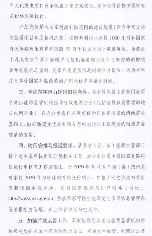文件明確,2020年競價(jià)項(xiàng)目配置工作總體思路、項(xiàng)目管理、競爭配置方法仍按2019年工作方案執(zhí)行;平價(jià)項(xiàng)目可由各省級能源主管部門在落實(shí)接網(wǎng)、消納等條件基礎(chǔ)上自行實(shí)施。