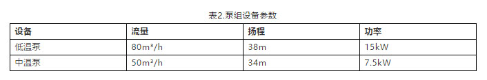 選取DC1棟冷凍系統(tǒng)末端回水為取水口,通過園區(qū)內(nèi)一段地埋管道輸送到辦公樓冷機房內(nèi)。在辦公樓冷機房內(nèi)安裝兩臺循環(huán)水泵,將20℃冷凍回水送至熱泵機組,并將熱泵機組15℃回水送至DC1棟機房。其水泵選型如下: