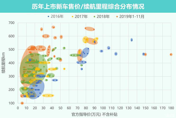 此外,雖然補(bǔ)貼逐年退坡,但從指導(dǎo)價(jià)和續(xù)航里程分布情況來(lái)看,新車的性價(jià)比正在不斷的升級(jí)。越來(lái)越多的新車在續(xù)航里程不斷突破新高的同時(shí),指導(dǎo)價(jià)卻不斷下探。隨著技術(shù)的不斷發(fā)展,供應(yīng)鏈的不斷成熟,當(dāng)純電動(dòng)車在成本和核心要素都能與燃油車持平時(shí),其產(chǎn)品競(jìng)爭(zhēng)力將會(huì)充分展現(xiàn)出來(lái)。