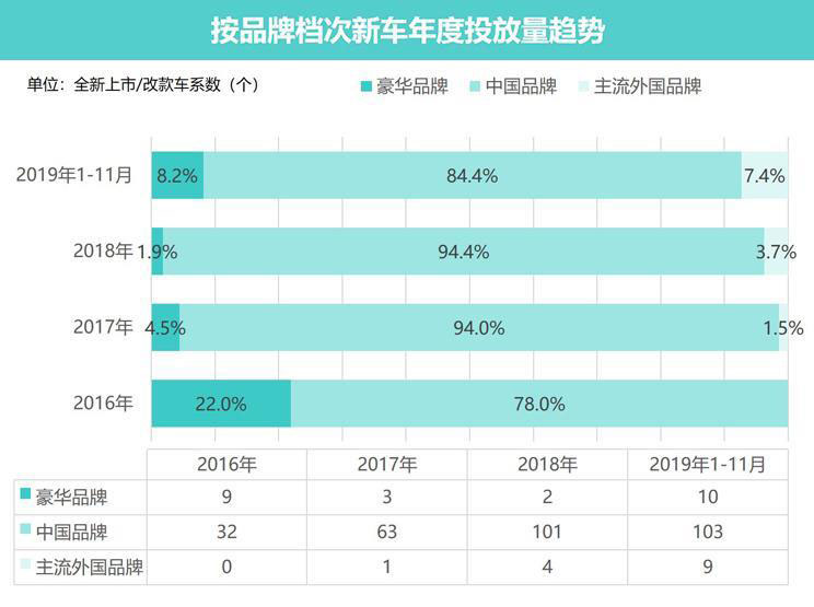 從品牌檔次維度看,中國(guó)品牌最早洞察先機(jī),迅速布局新能源純電動(dòng)車市場(chǎng),年度推新數(shù)量始終占據(jù)絕大份額。但2019年,豪華品牌和主流外國(guó)品牌發(fā)力市場(chǎng),推新量同比大幅上漲,盡管與整體市場(chǎng)相比仍是鳳毛麟角,但事實(shí)上已然實(shí)現(xiàn)了較大突破。鑒于其雄厚的產(chǎn)品體系和研發(fā)能力,預(yù)計(jì)新產(chǎn)品在2020年將會(huì)更多的推向市場(chǎng)。