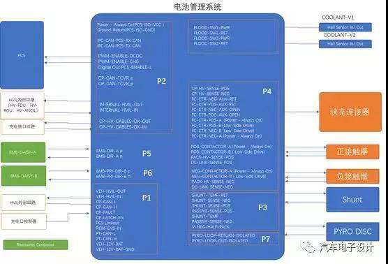 下圖是我通過線路原理圖做了分解,整個電池管理系統(tǒng)面向內部主要連接快充連接器、溫度傳感器、正負接觸器、電流傳感器、可控熔絲、內部的PCS(DCDC和OBC)的單元菊花鏈CMU控制器,還有面向外部的供電單元、外部HVIL電路、充電控制板、動力總成CAN。